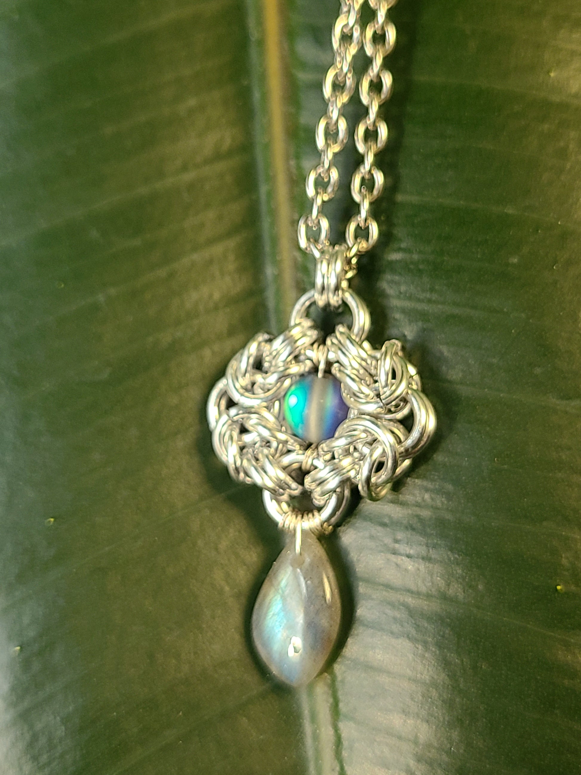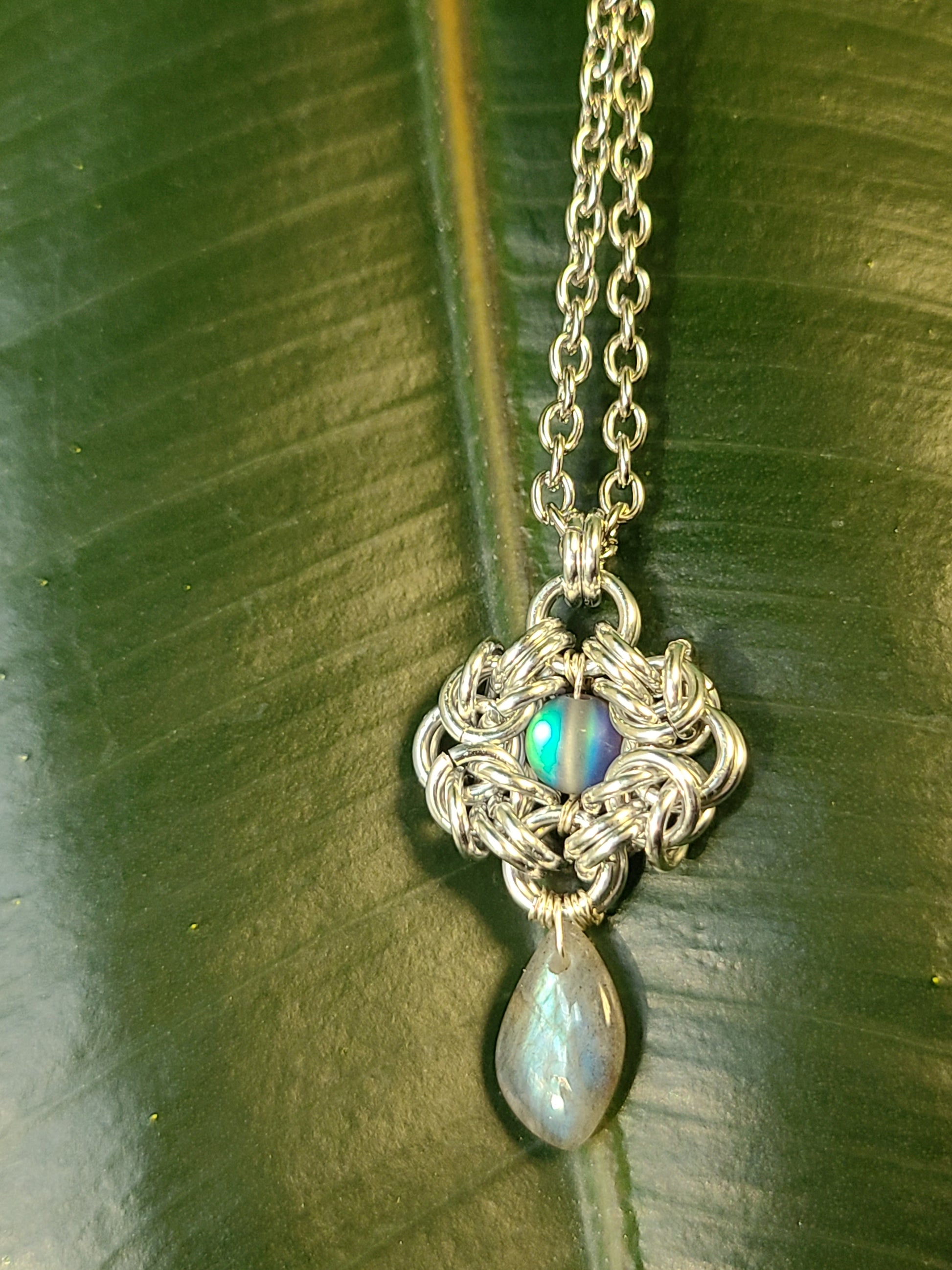 This necklace features byzantine woven chainmail with a real Labradorite stone dangling below, and a synthetic Labradorite bead strung between the lightweight aluminum chainmail. Sure to catch eyes when it flashes in the sunlight. Stainless steel chain included.