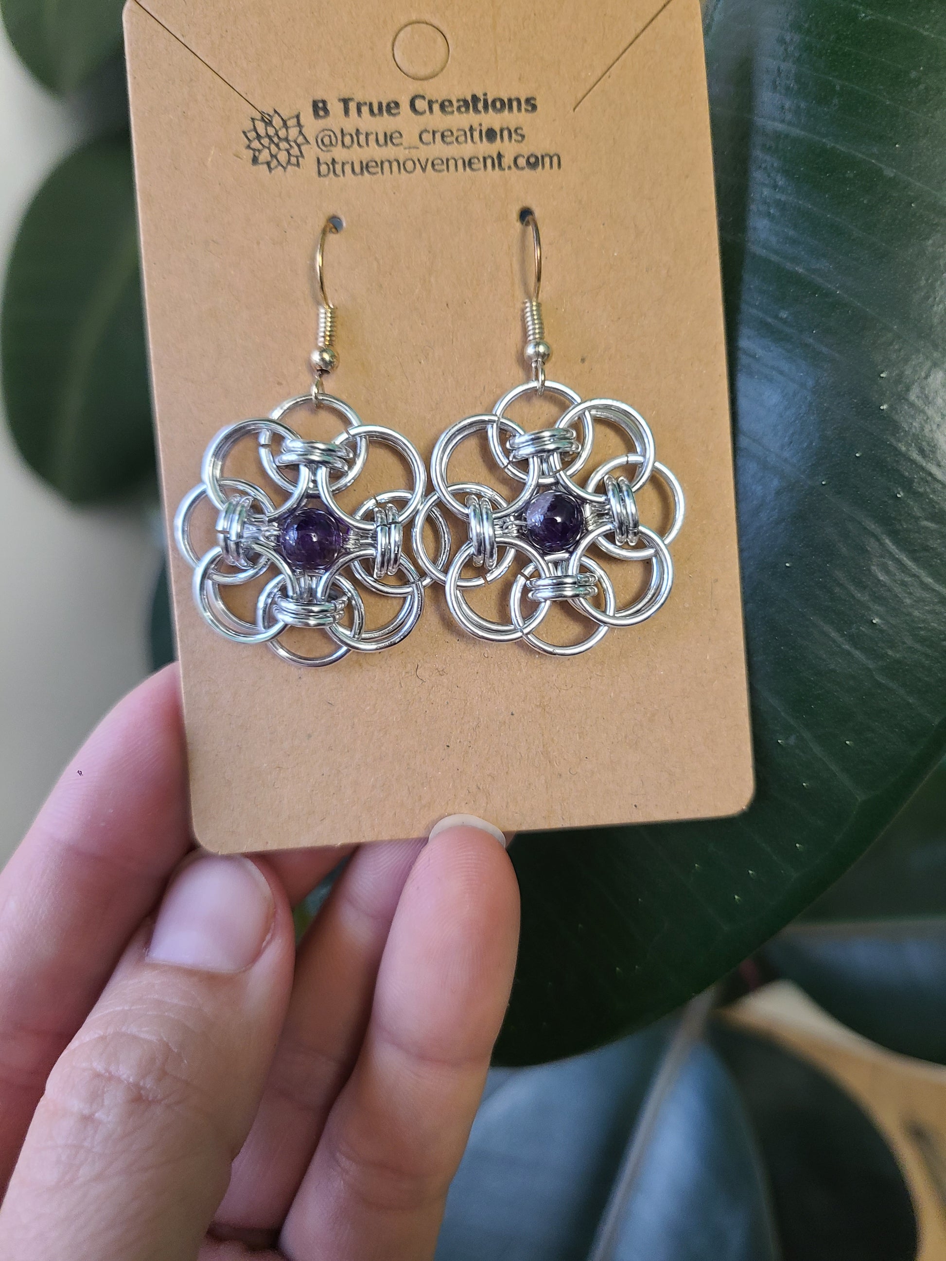 Lightweight aluminum chainmail earrings - Helm Flower design with Amethyst beads