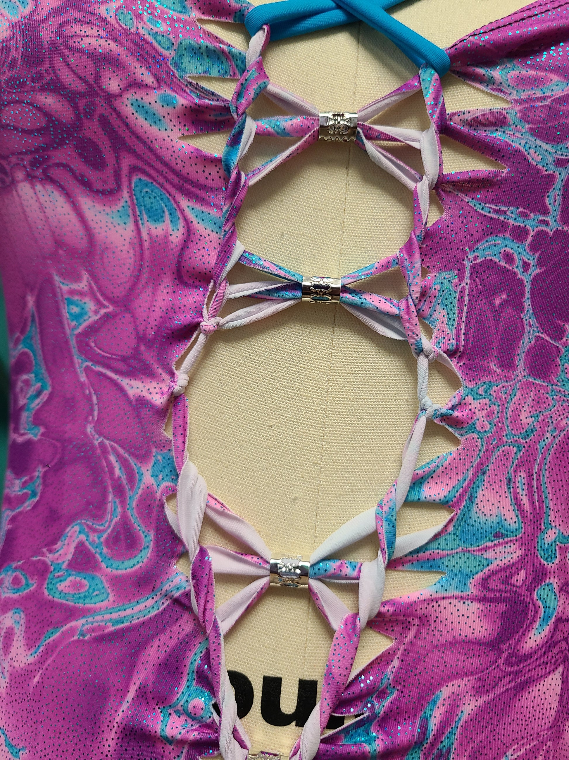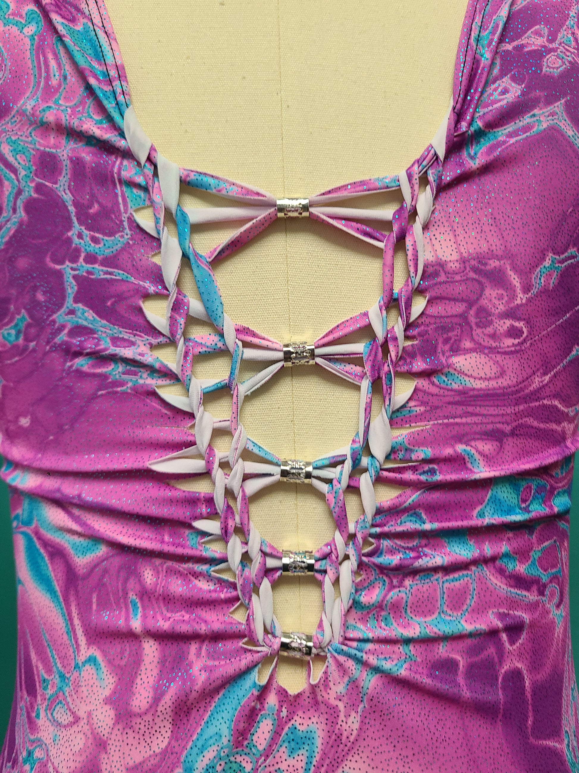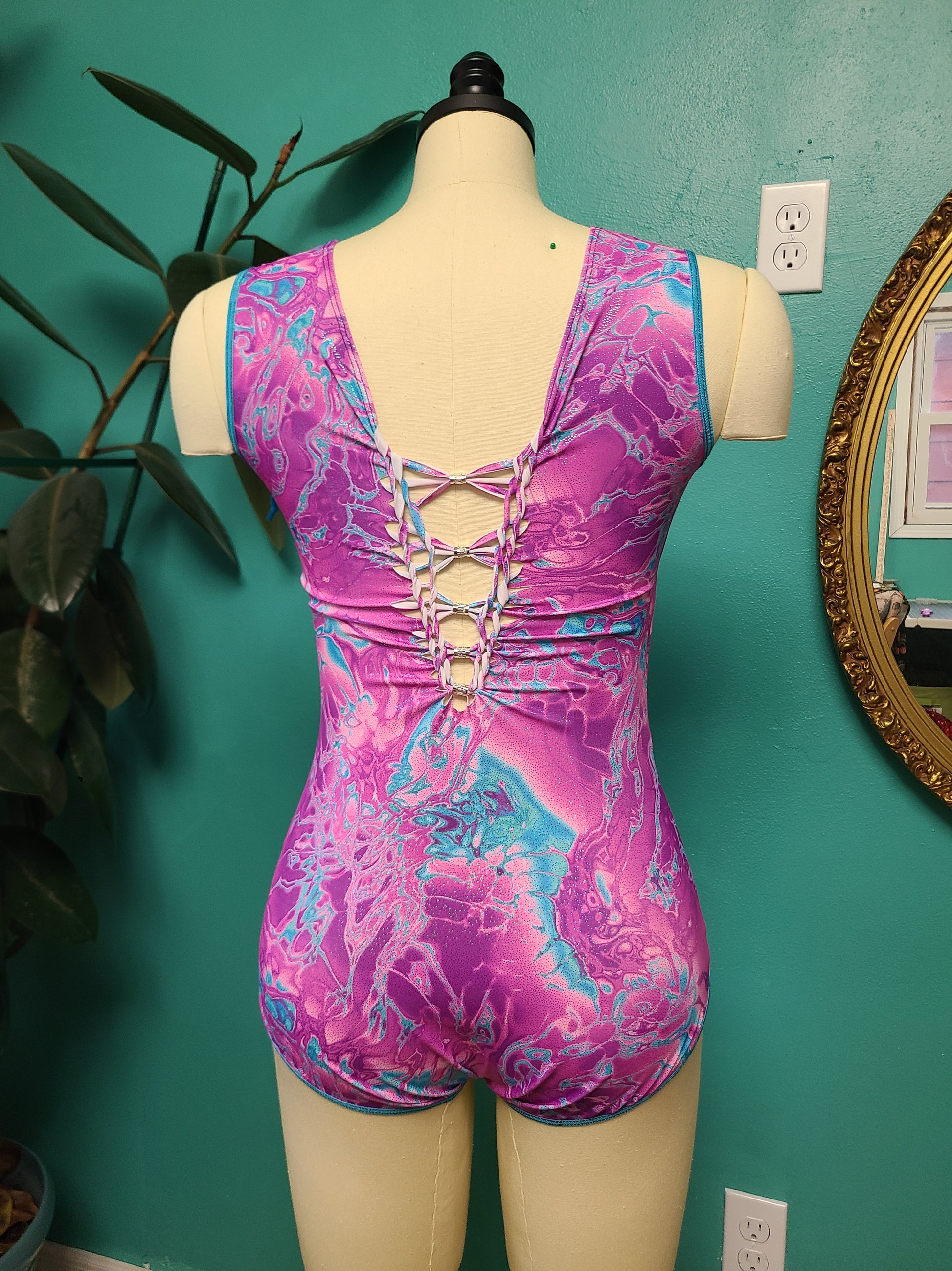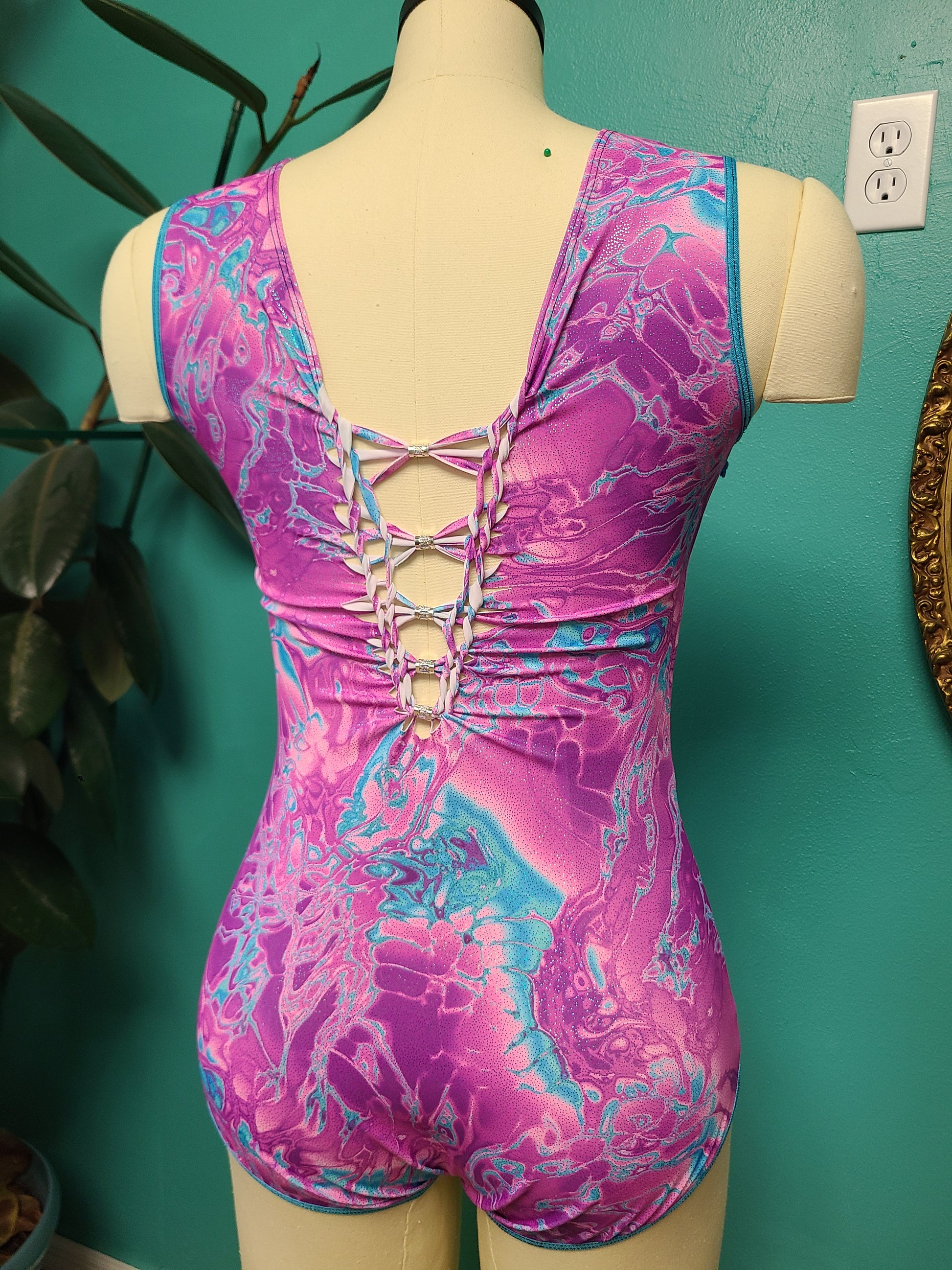 Barbie at the Rave! This slit weave bodysuit is adorned with silver beads and finished with contrasting elastic. Size 8 - US Medium