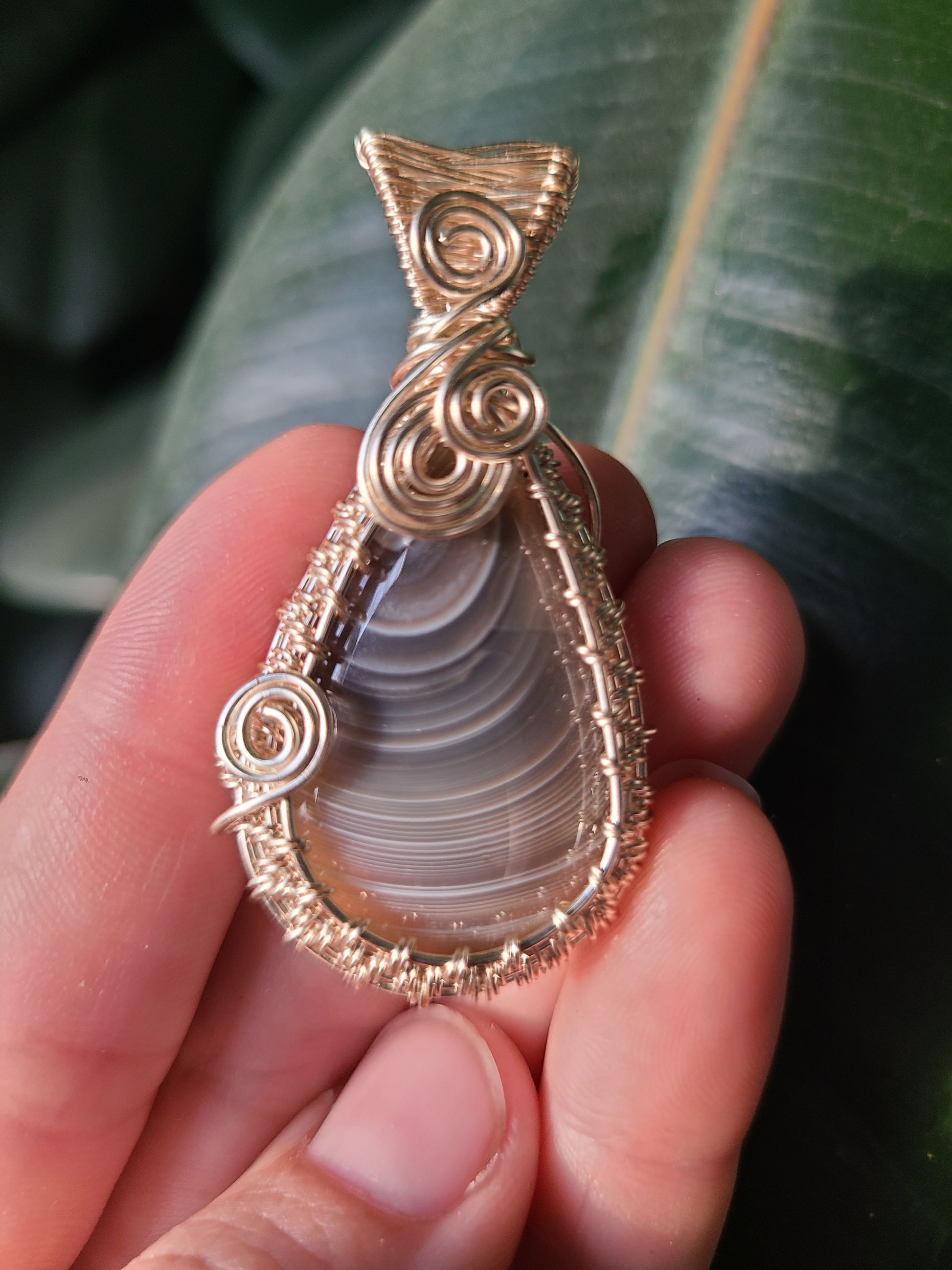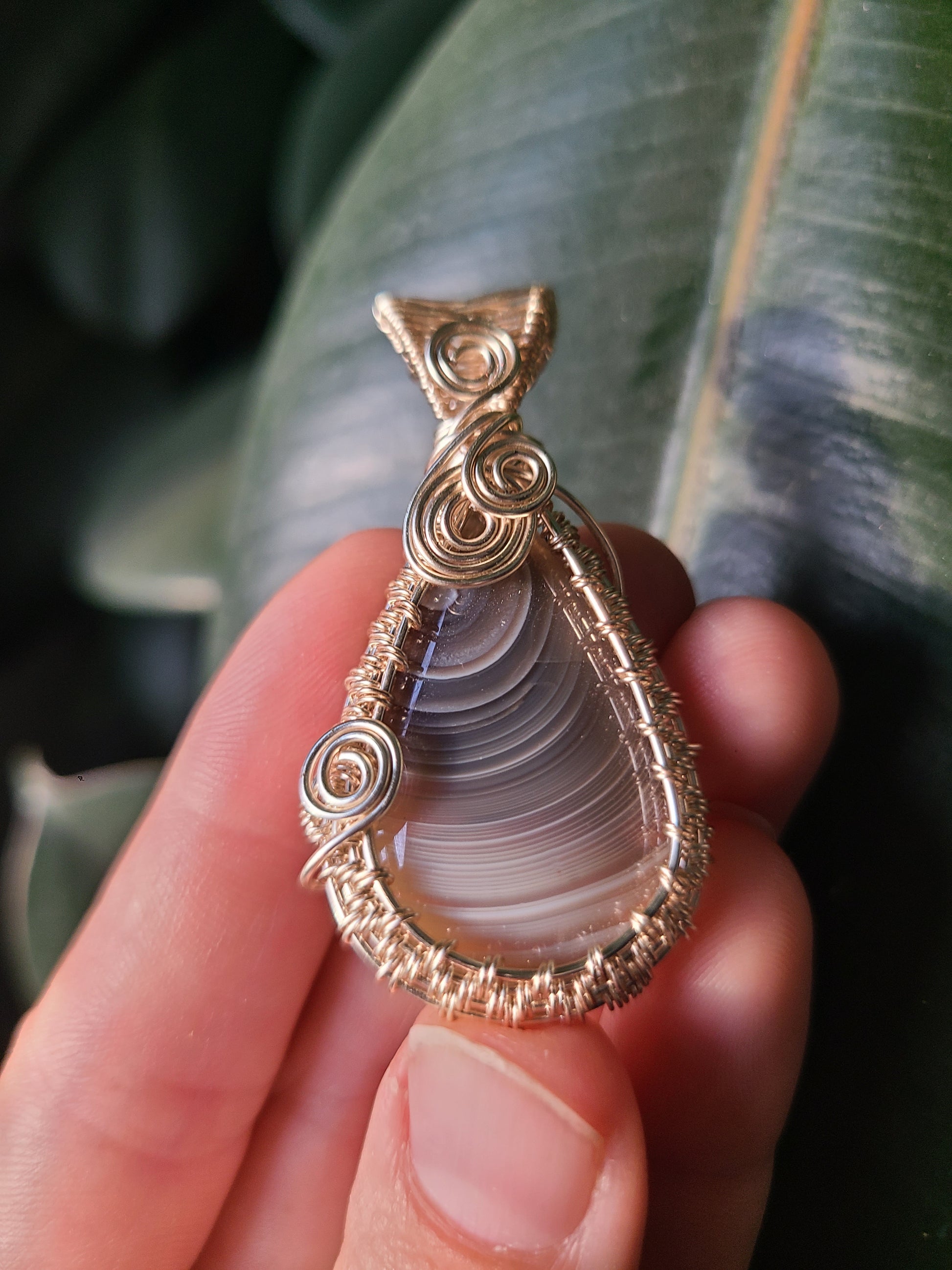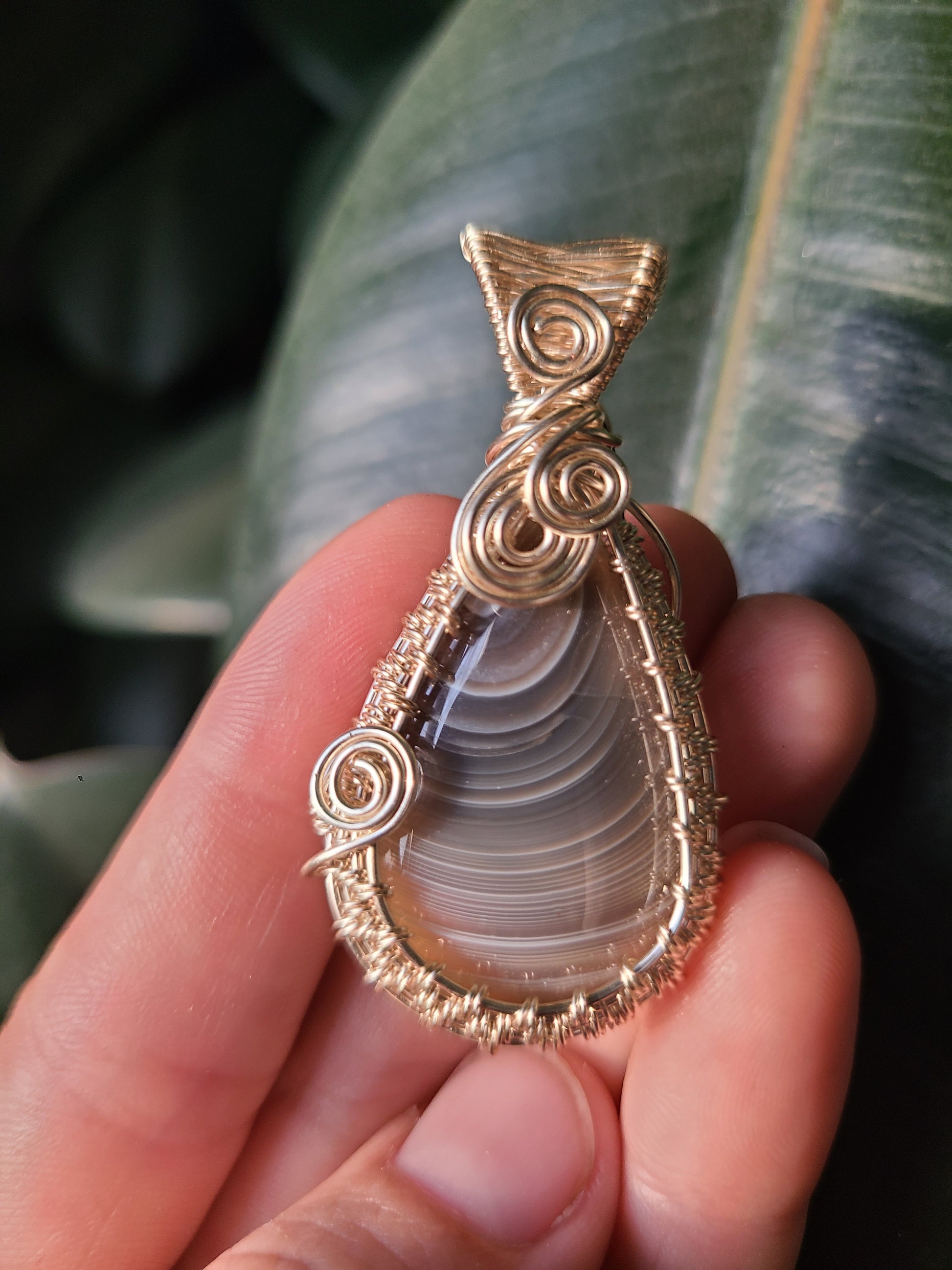 This stunning Botswana Agate is semi translucent and full of beautiful swirled bands. Wrapped in plated craft wire that won't tarnish, with intricate weaving and swirls that complement the stone.