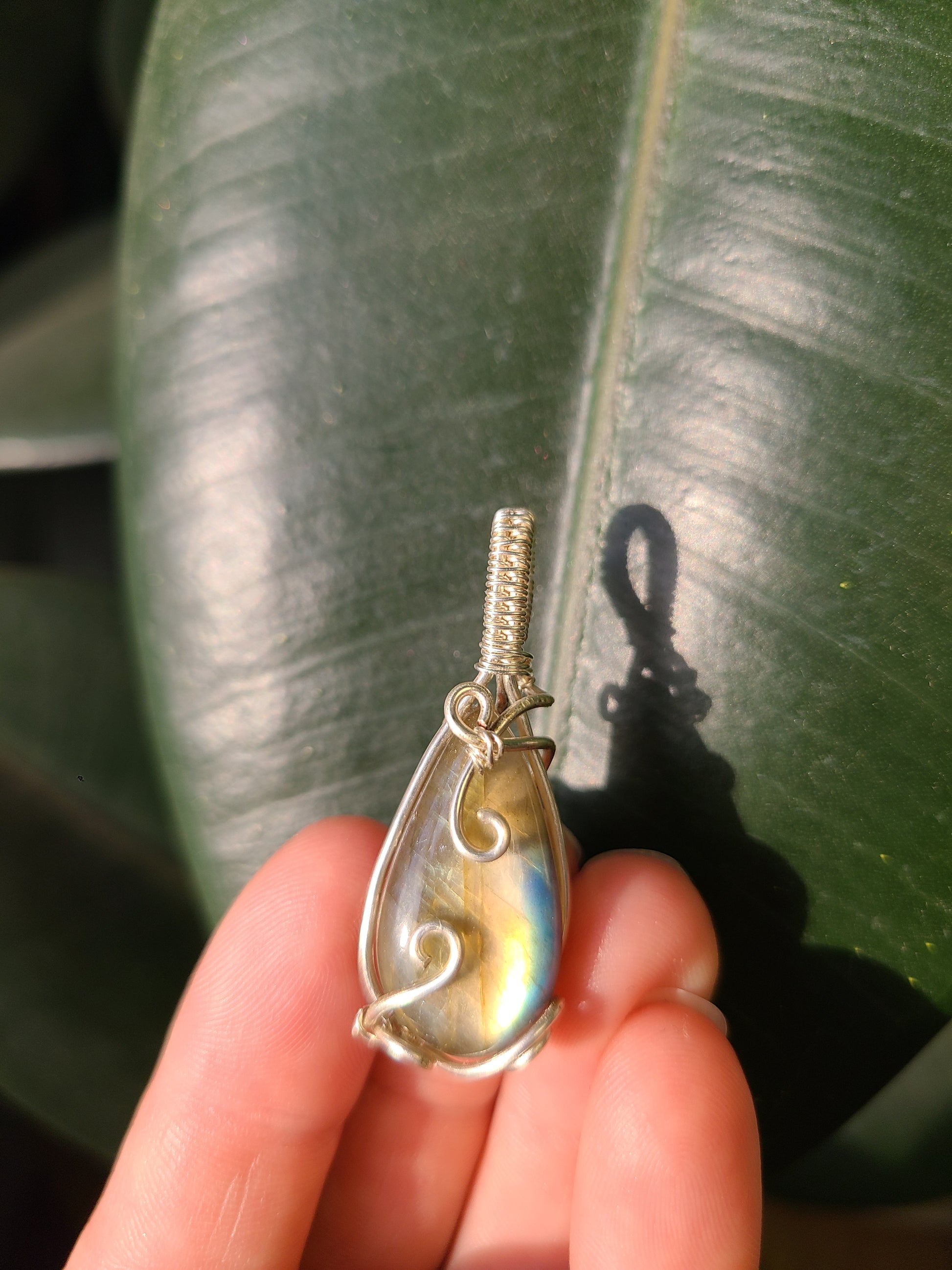 With a simple wire wrap, this Labradorite Pendant let's the stone do all the talking. Such a beautiful flash in natural lighting. Wrapped in tarnish resistant plated wire.