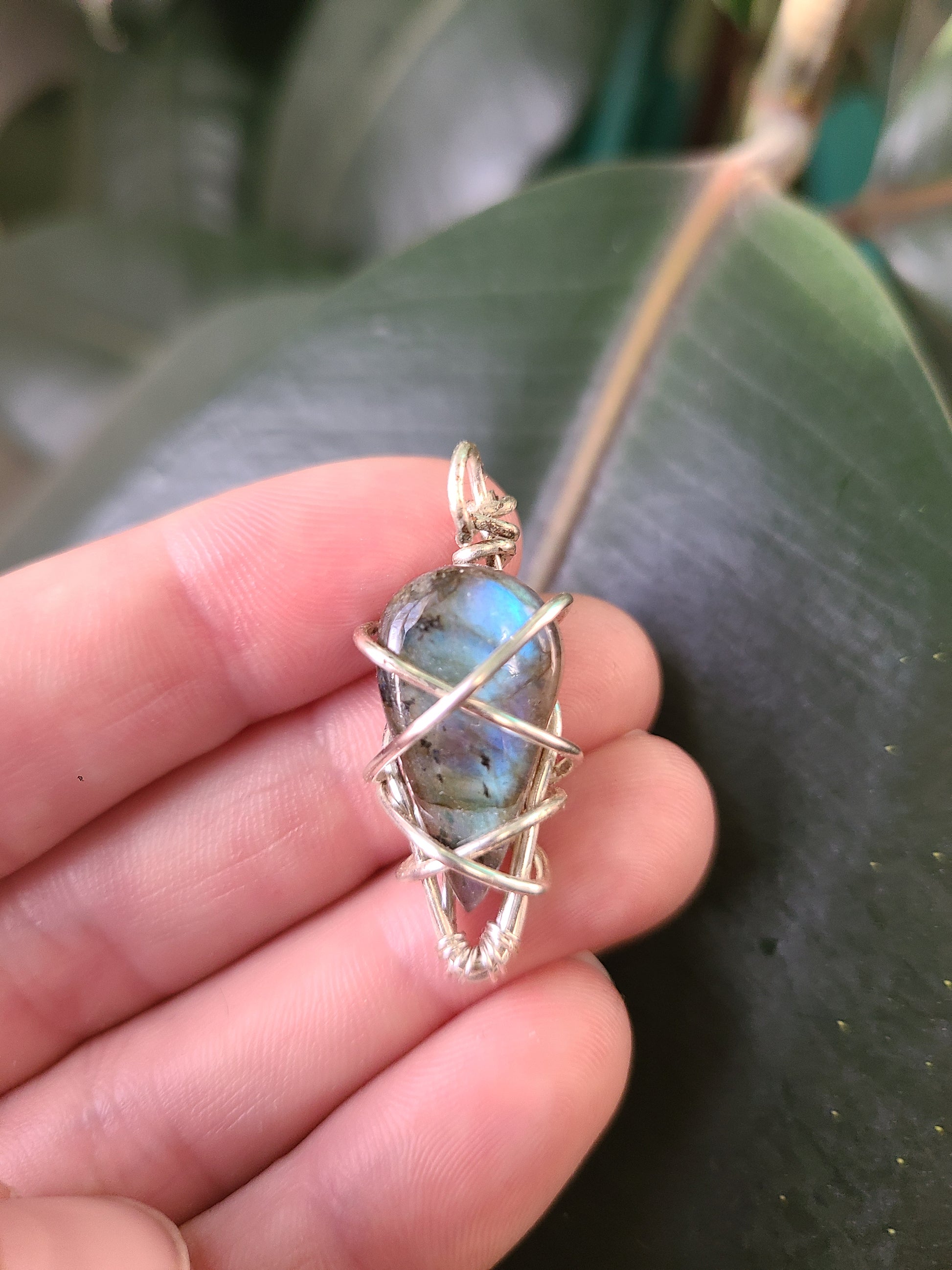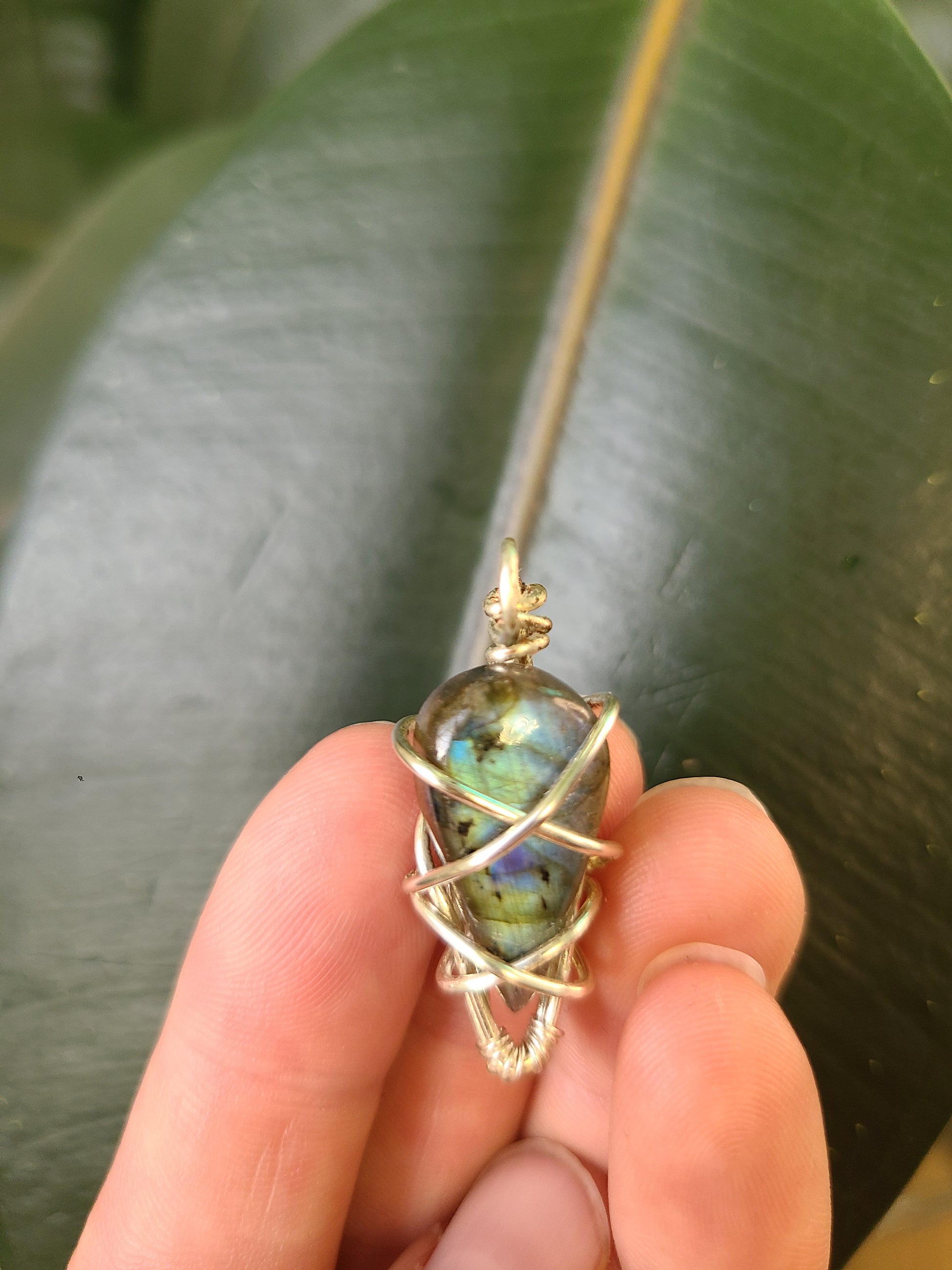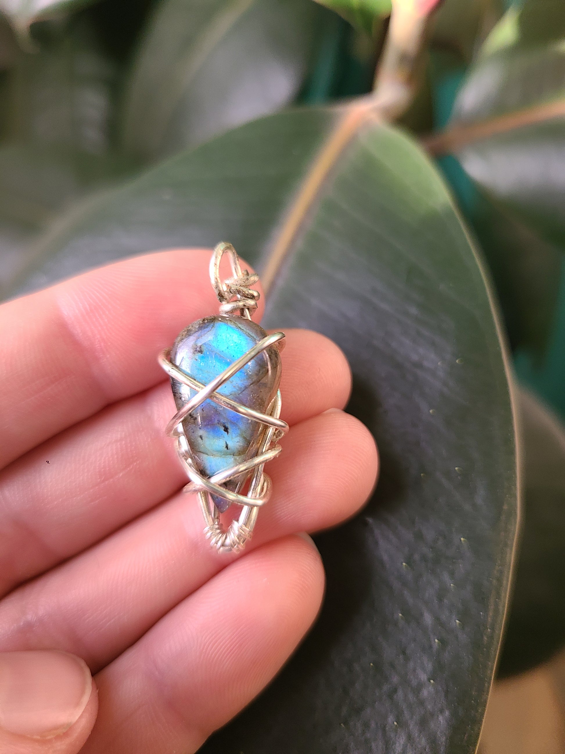 Catch different flashes of color at every angle with this small but impressively beautiful Labradorite stone wrapped in tarnish resistant plated jewelry wire.