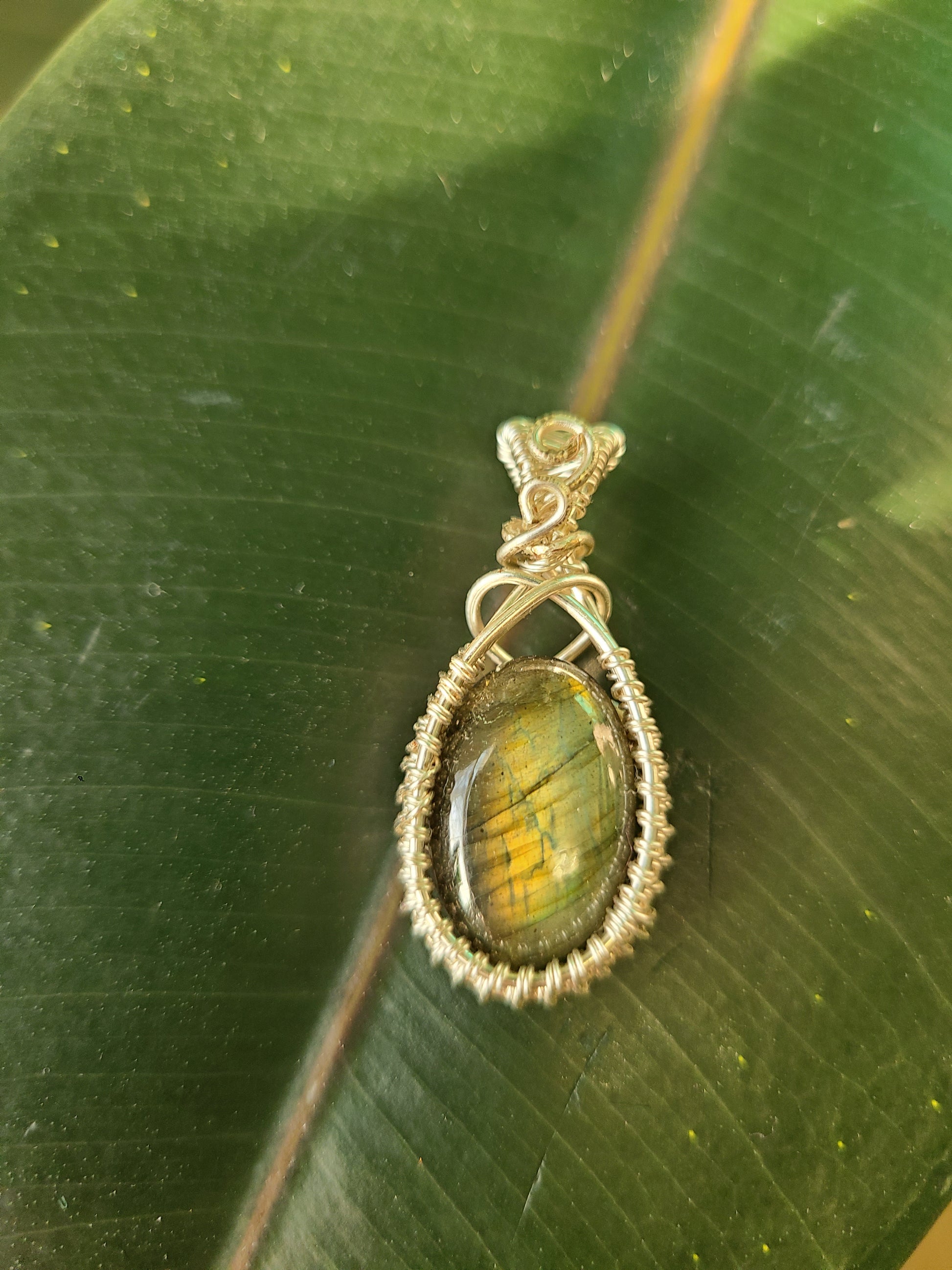 This Labradorite is small, but stunning. Wrapped intricately with tarnish resistant jewelry wire.