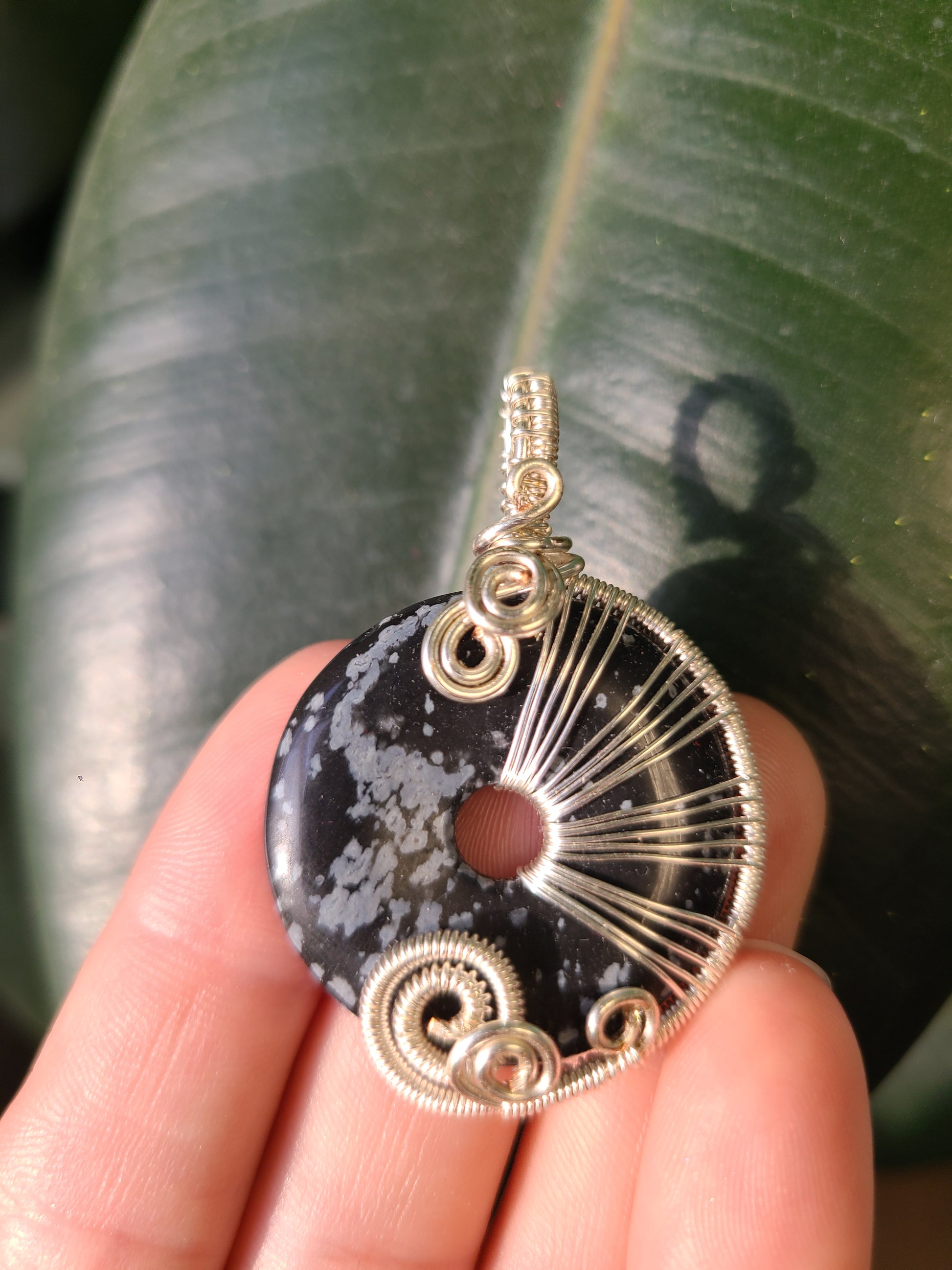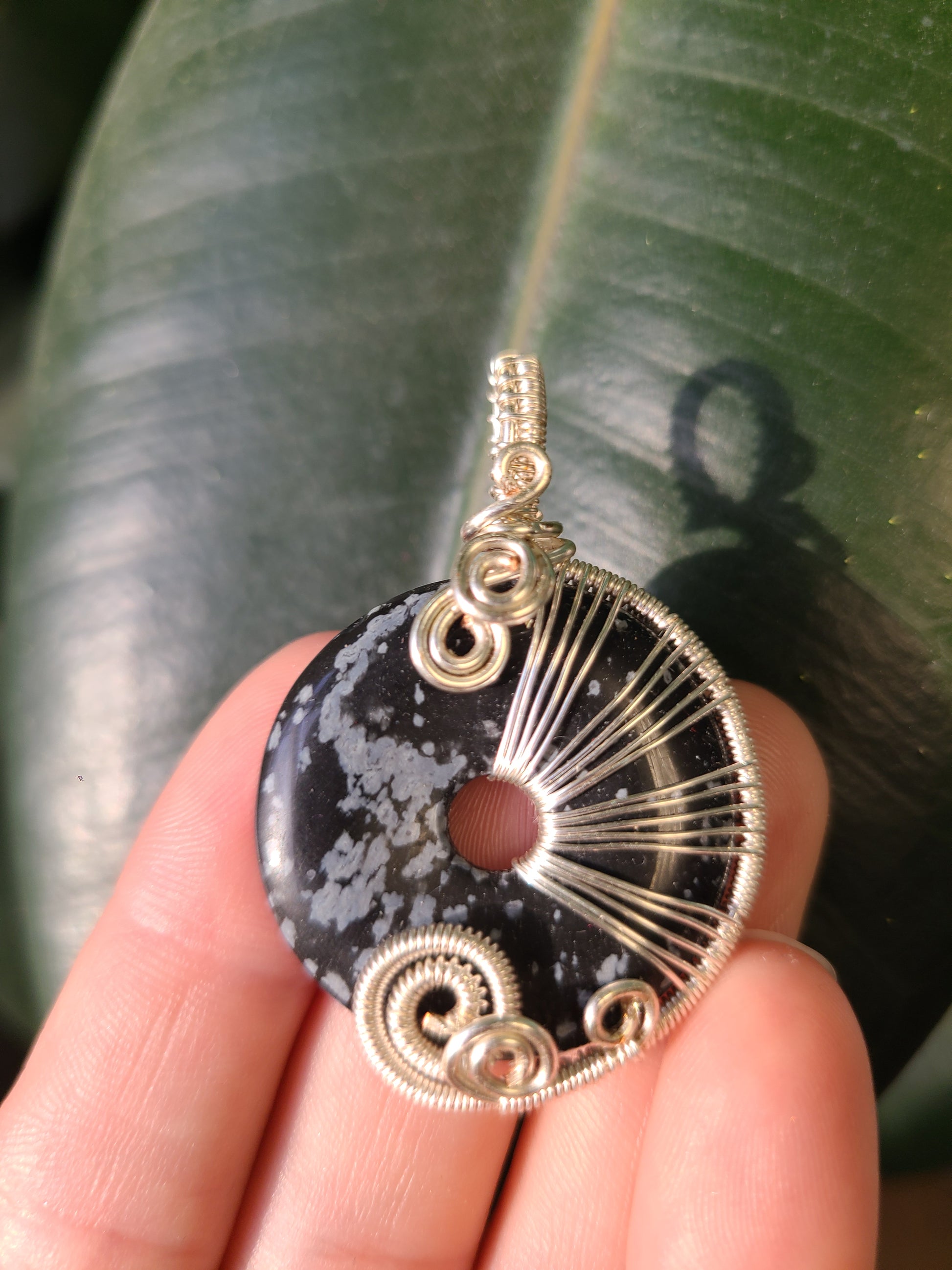 Snowflake Obsidian "donut" wrapped in plated craft wire that won't tarnish. Stylish and unique Pendant.