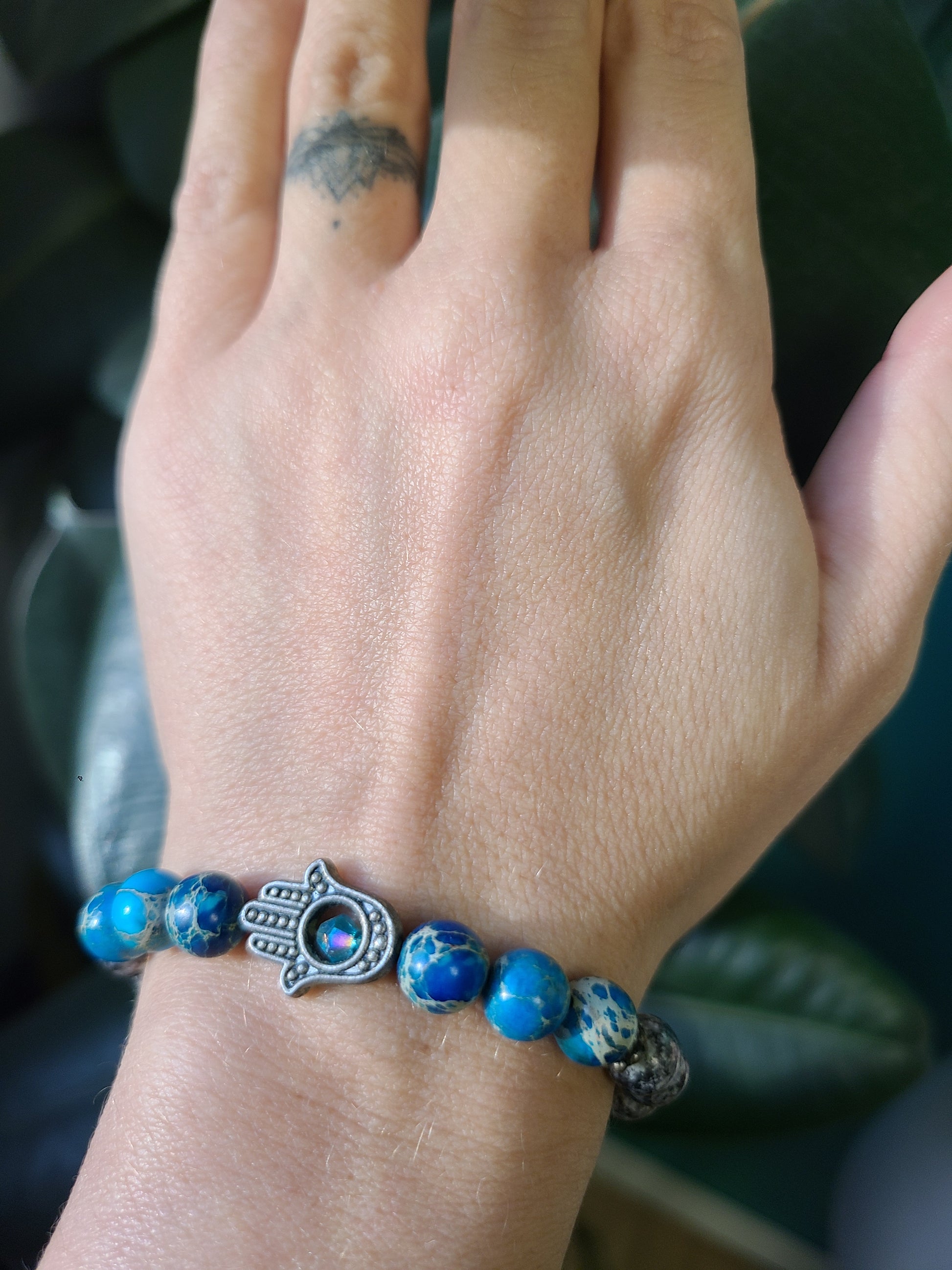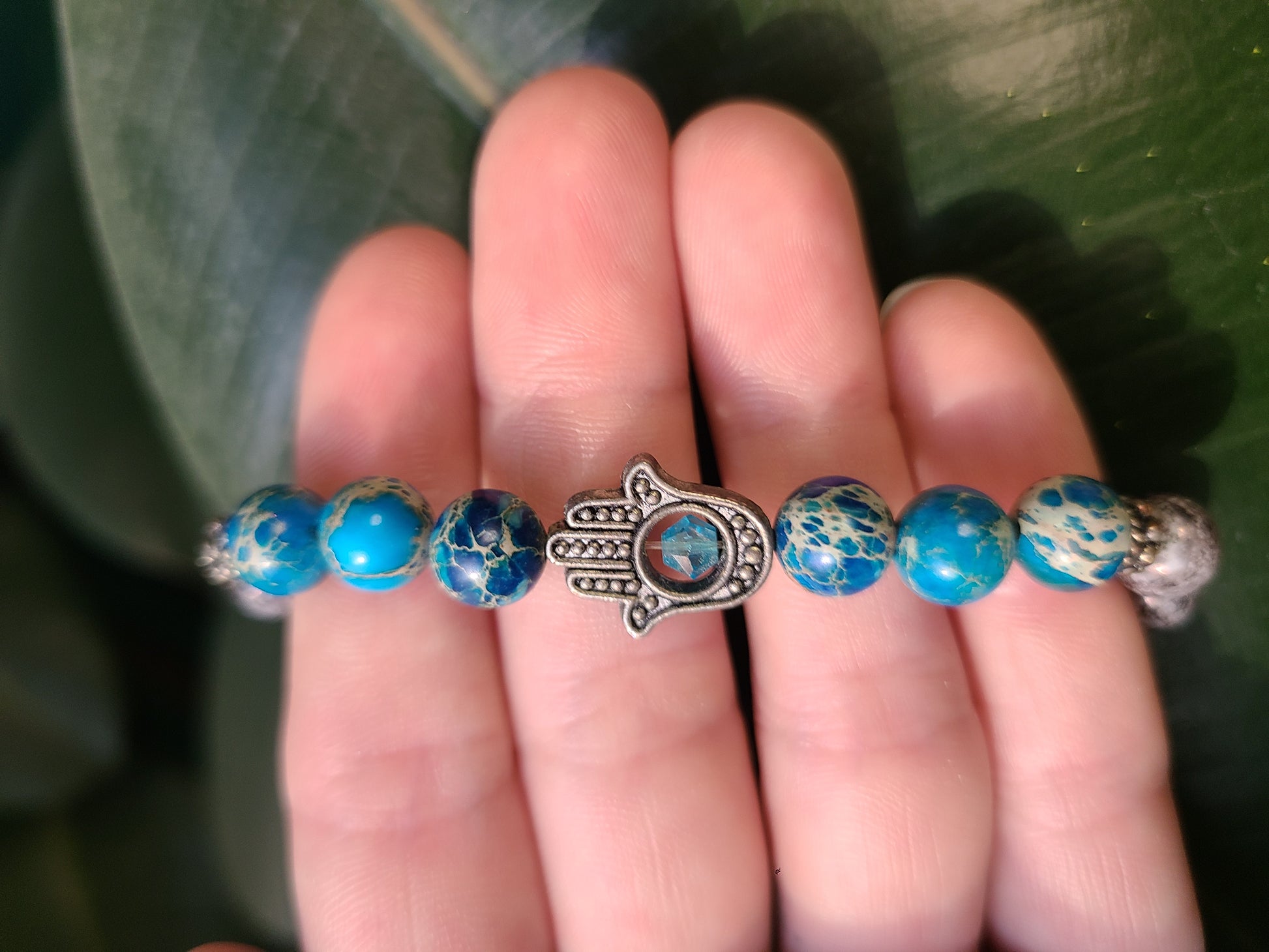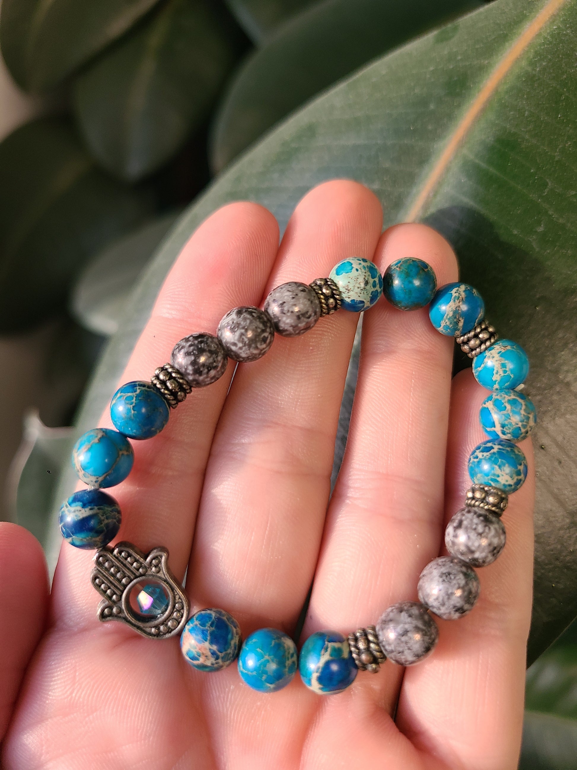 Turquoise dyed Jasper Yoga Bracelet with silver & Grey accent beads - strung on stretchy beading line for hassle free wear.