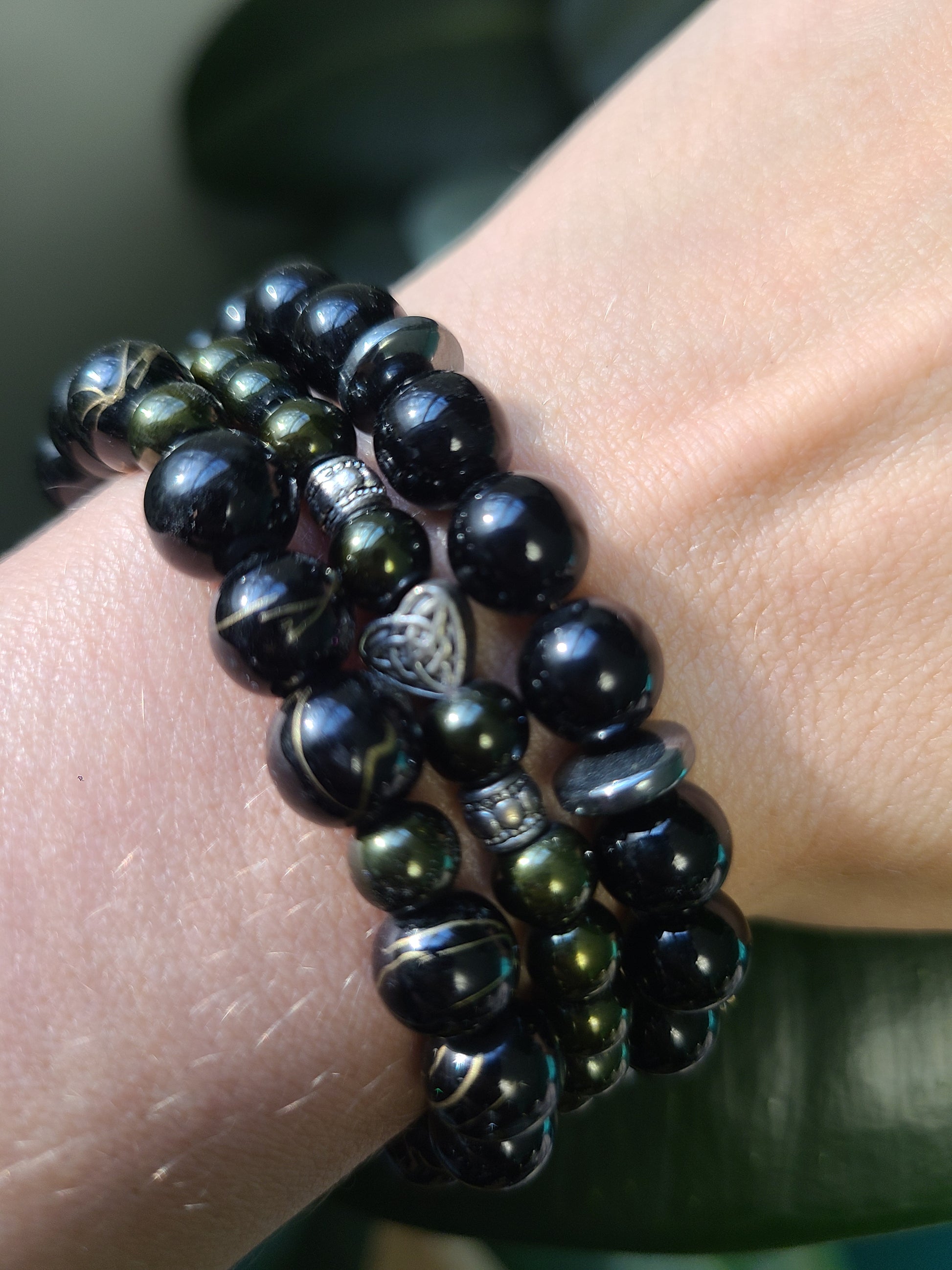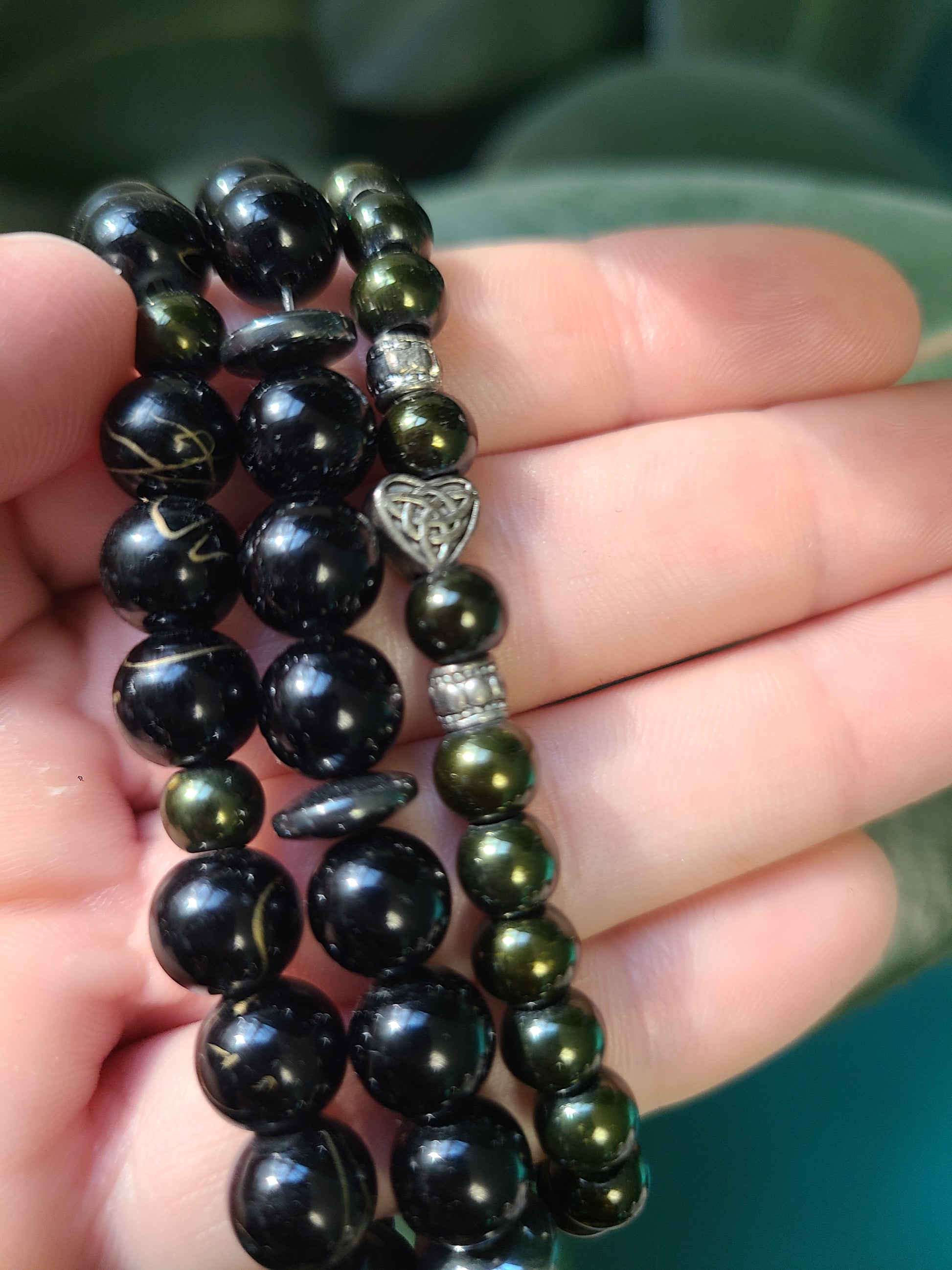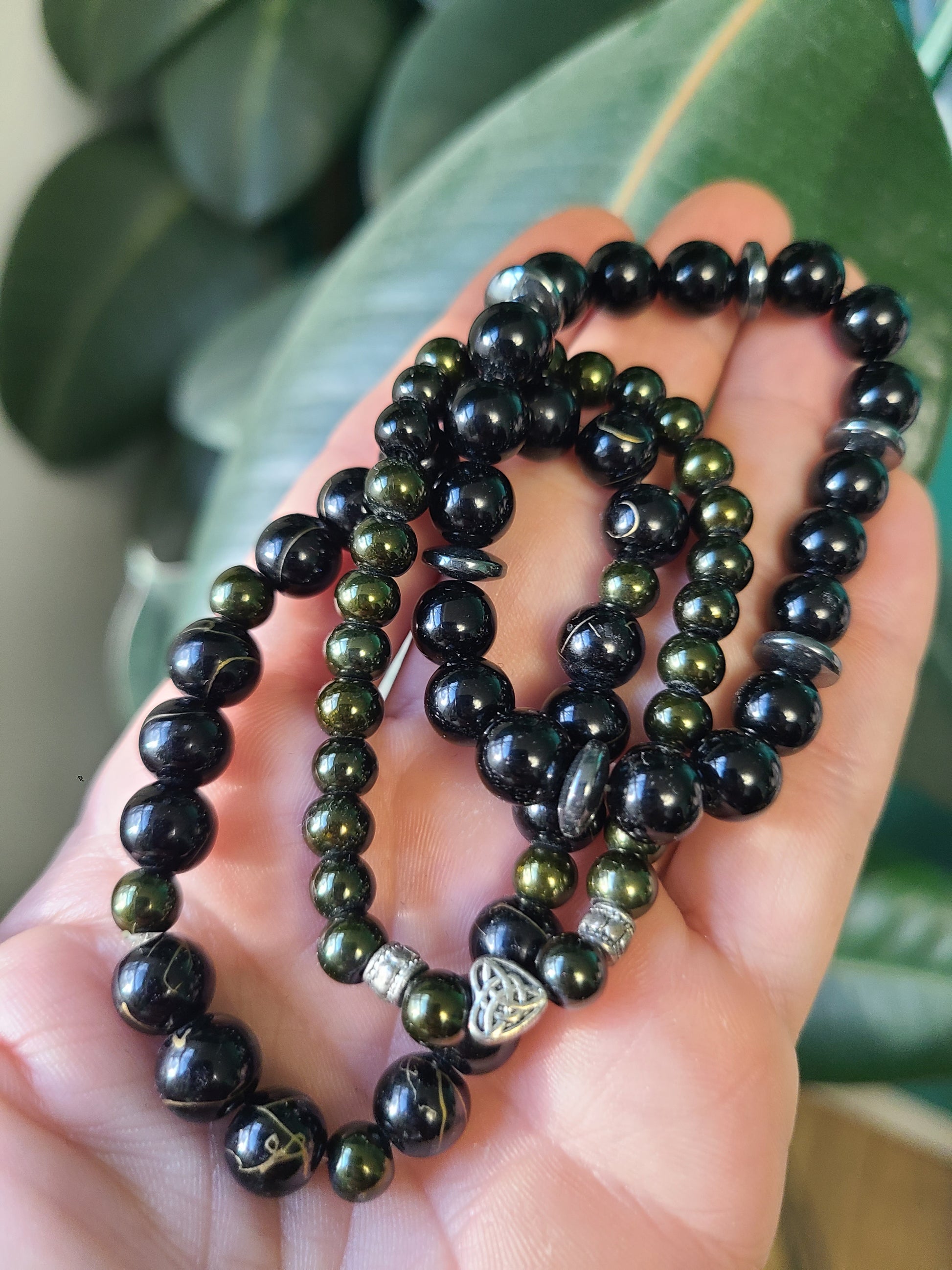 This Yoga Bracelet Set comes with 3 beaded bracelets in tones of black, gold, hematite, and dark olive. Strung on stretchy beading line for hassle free wear.